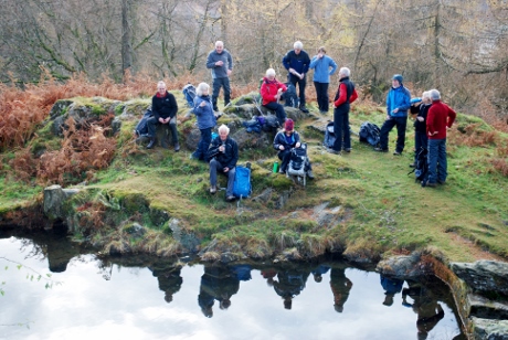 Graham & Irene, Tony & Sue, Mick & Clare, Colin & Val, Jan, Frank, Hugh, Sam, and Norman Thirteen members and friends had a lovely mid-week walk with decent weather. Led by Graham and Irene, the group met up at Broadgate car park where the drivers were advised charges of £8 for all day parking. Walking up behind Forest Side hotel with its walled garden now converted to a series of raised beds, the route soon joined the main path up from Townend. Coffee was taken at a small tarn with a lovely reflection, before setting off again and reaching Allcock Tarn for lunch. Then along to Nab Scar for great views, down to Rydal, and back along the coffin route. Tea and cakes rounded off an excellent day: thanks to Graham and Irene for the walk and the weather! |