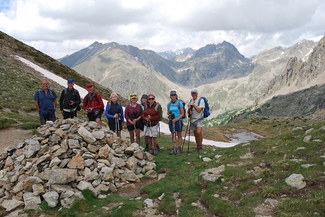 The group walked down the Vallon de Ponset, where marmot were heard and chamois seen. In the distance, the Col de Fenestre can be seen on the right of the central pointy peak, with the Pas des Ladres on its left |