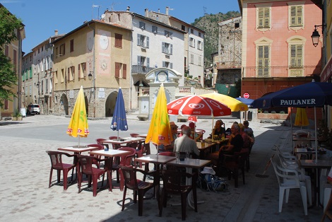 Coffee was taken in the main square of Utelle. The pinkish building behind on the right is a good example of a Trompe l'oeil in that the windows are painted onto a blank wall. |